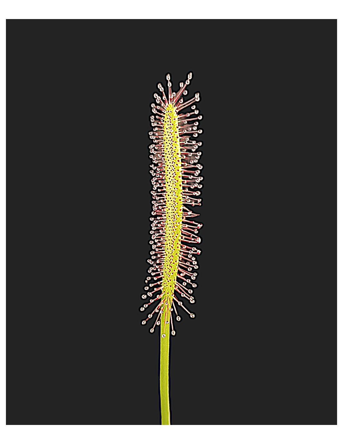 Lo que más llama la atención de esta especie son sus glándulas rojizas, que producen un mucílago pegajoso para atrapar pequeños insectos. Estas gotas relucientes no solo son efectivas para la captura de presas, sino que también aportan un toque visual único, dándole un brillo especial a la planta.